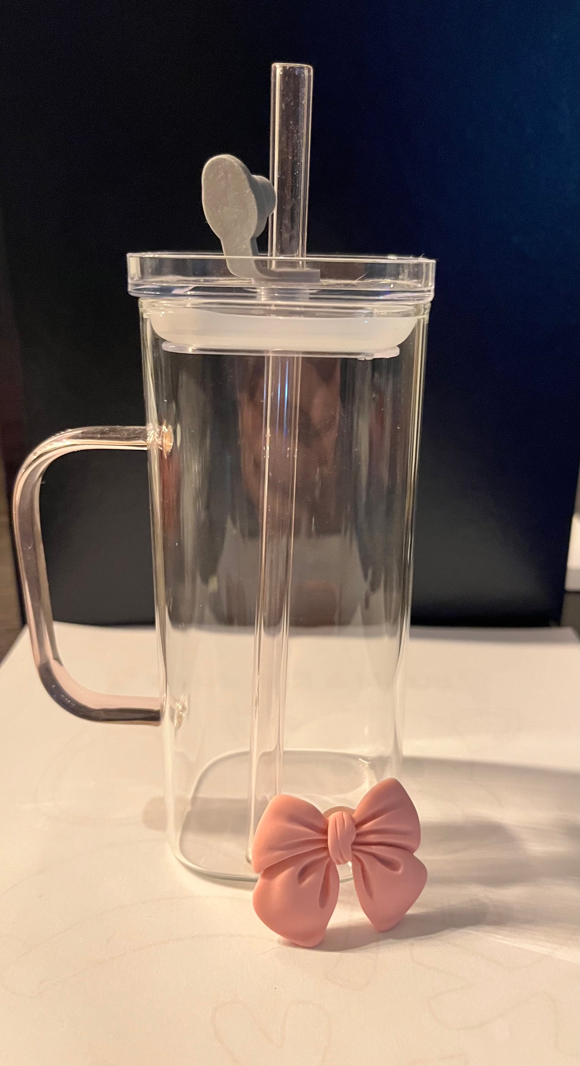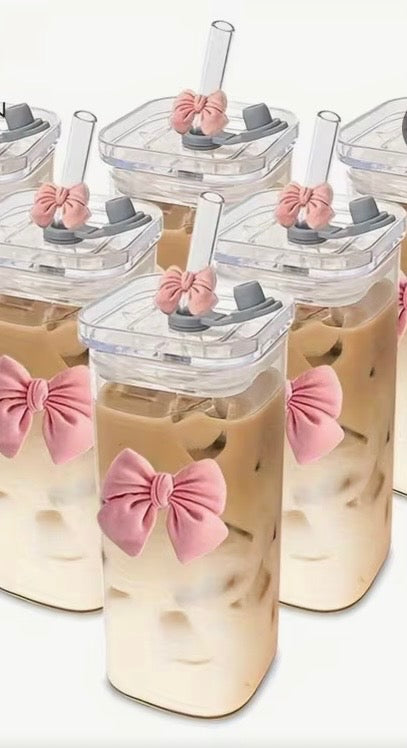 Bow drinking glass 12oz/ 350ml. Includes glass straw with lid. Bow is an adhesive that you can put anywhere on the cup.