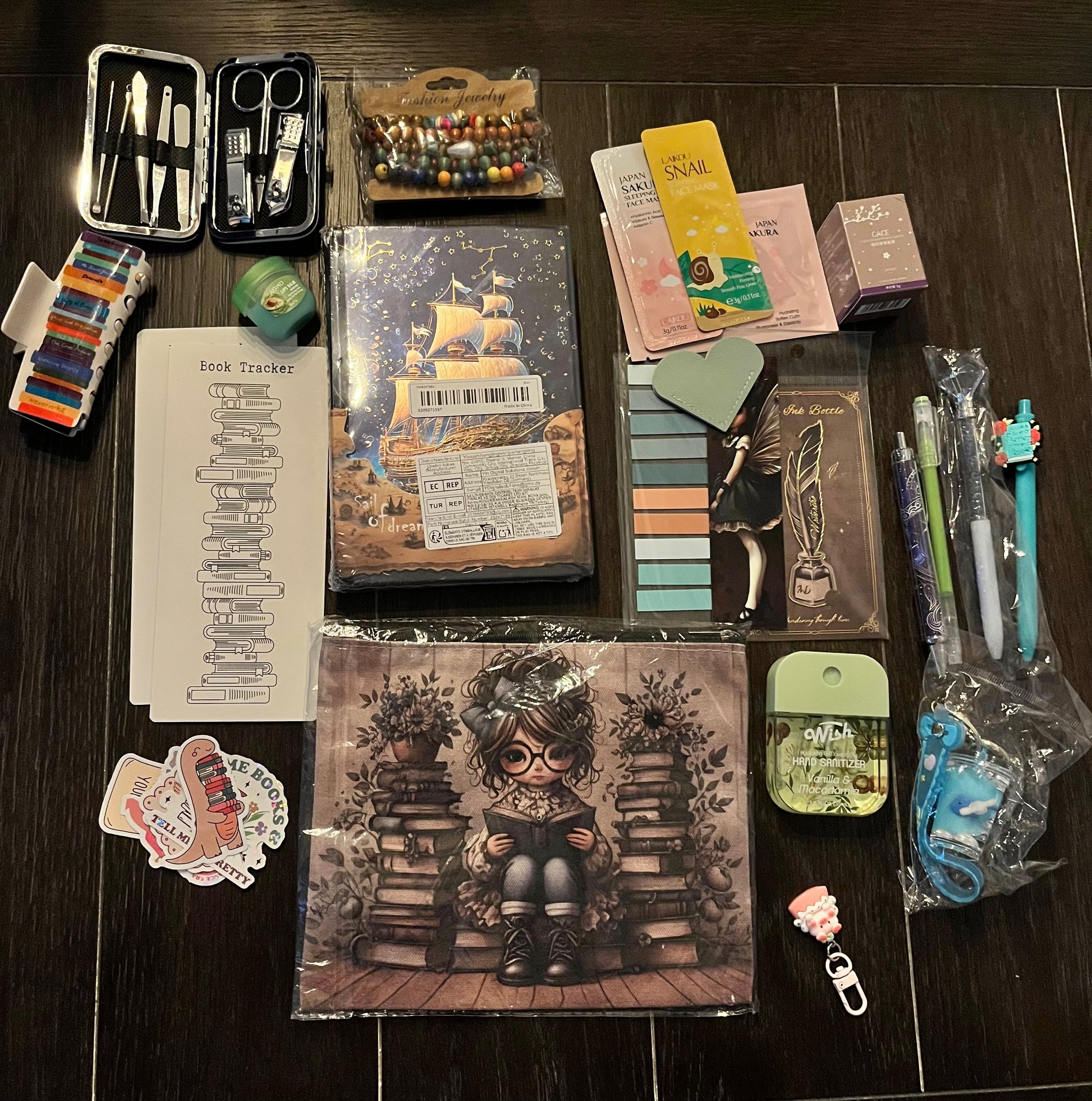 This bundle includes: Large premium journal, 2 book trackers, bracelet set, book hair clip, regular nail kit, 2 face masks, Lip mask, spray hand sanitizer, lip balm, cherry dipper lip mask, pencil case, Small sticky notes, 4 RANDOM pens, 2 RANDOM keychains, 2 RANDOM bookmarks, 1 metal bookmark, 6 RANDOM stickers.