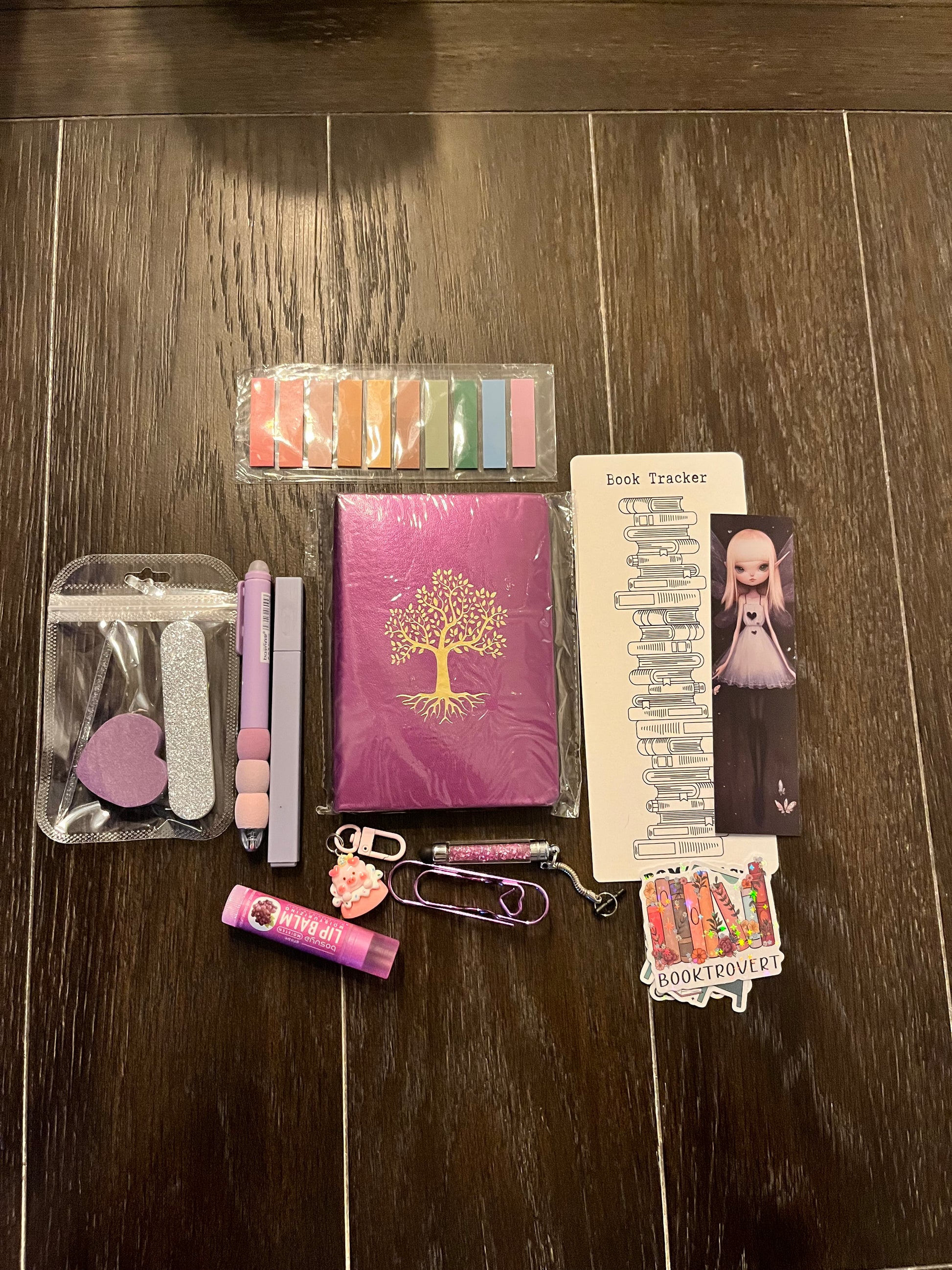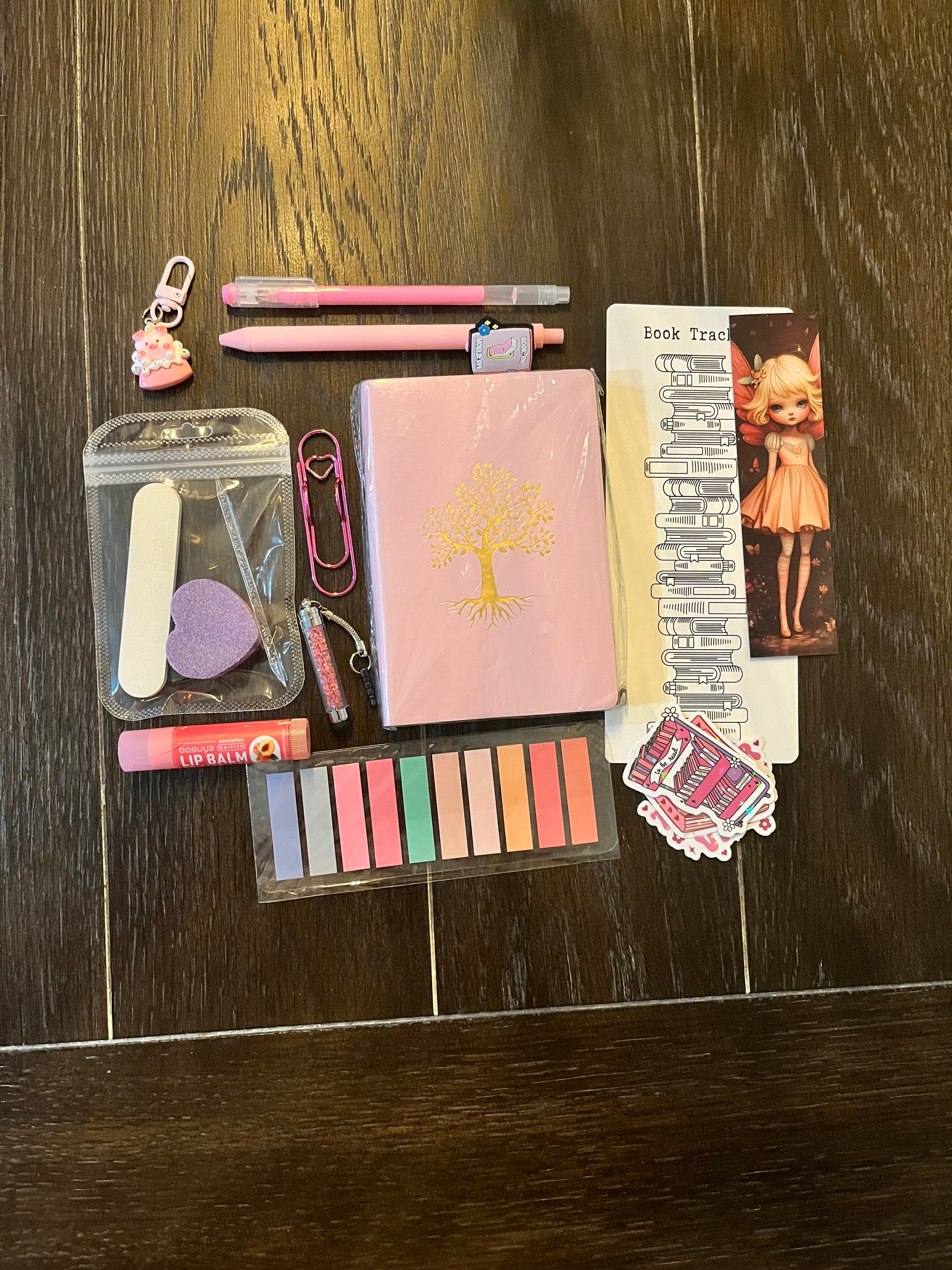 This bundle include: Small Journal, stylus, small sticky notes, 1 book tracker, pen clip, basic nail kit, chapstick, 1 RANDOM bookmark, 2 RANDOM pens, a small pig keychain, and 3 RANDOM stickers
